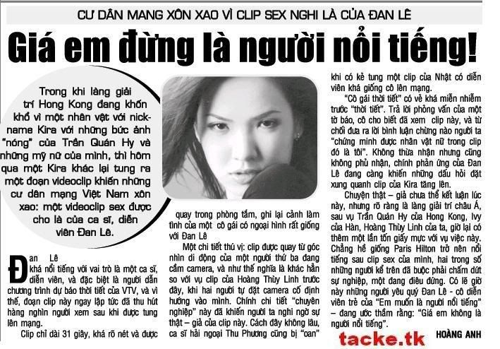 Cư dân mạng đang sôi sục thông tin về clip sex, trong đó nhân vật “nữ chính” được cho rằng có gương mặt giống MC, diễn viên, ca sĩ Đan Lê. Tốc độ truy tìm clip “nóng” vẫn “bỏng” lên từng giờ, đặc biệt sau khi thông tin xuất hiện trên báo chí , Blog .Tất cả đang nhảy vào cuộc , hào hứng với scandal mới xoi mói , xâu xé " con mồi Đan Lê".