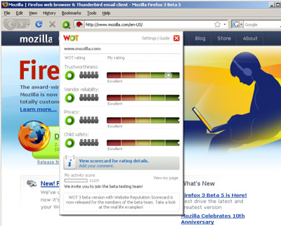 Weboftrust (WOT) thực chất là một mạng thông tin cộng đồng nhằm đánh giá độ an toàn của từng Website. Add on cùng tên WebOfTrust sẽ hiển thị một biểu tượng nhỏ bên cạnh địa chỉ website, cho biết site đó an toàn (xanh), nguy hiểm (đỏ) hoặc không rõ (vàng). Do các site nằm trong danh mục dược kiểm tra trực tiếp bởi người tham gia cộng đông WOT, bạn sẽ được bảo vệ an toàn tuyệt đối trước virus, phần mềm quảng cáo, site lừa đảo ..v.v.